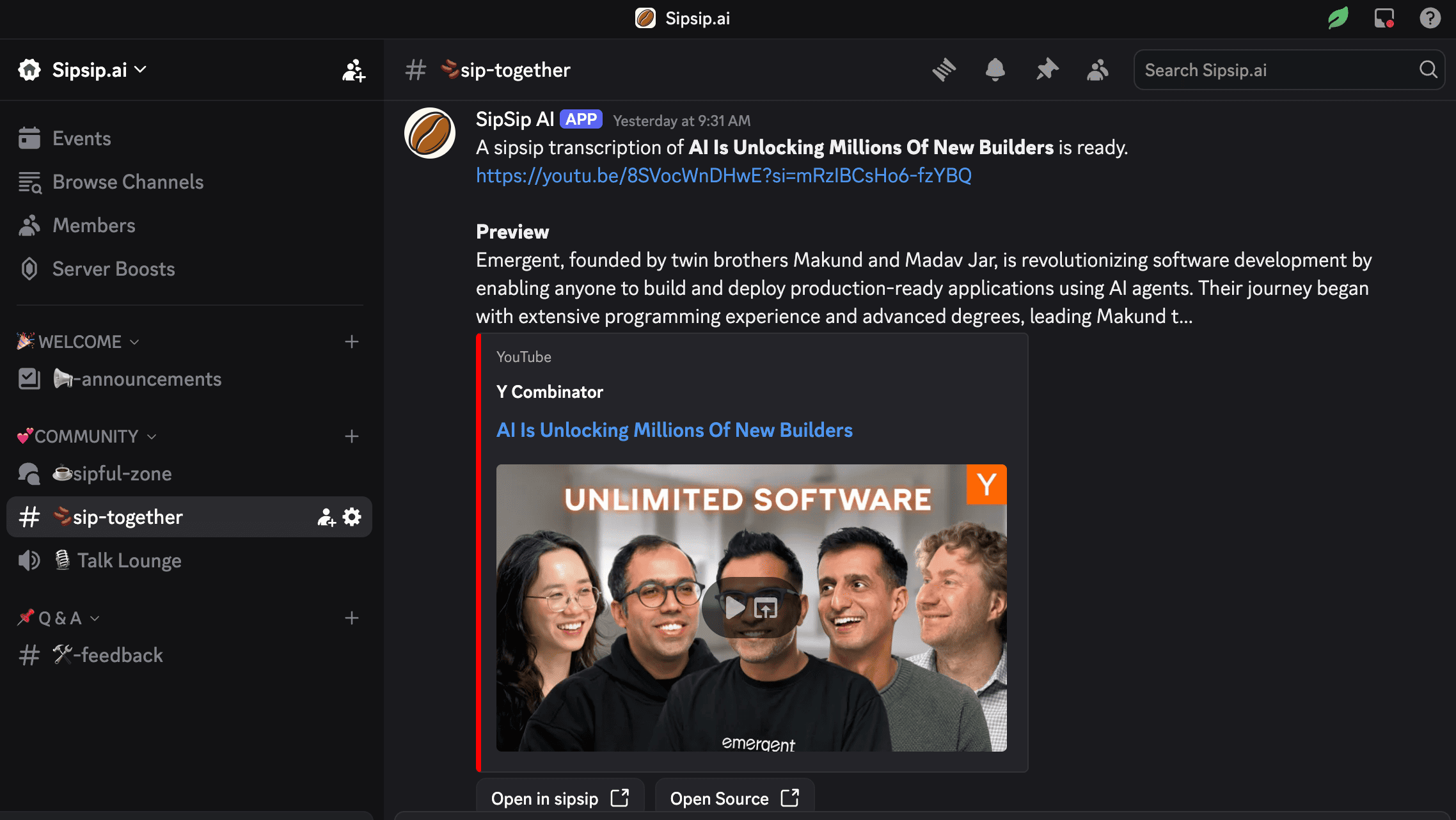 Add the SipSip AI bot to your server, then type /transcribe followed by any YouTube or podcast URL. The bot returns a full transcript and AI summary directly in the channel within seconds.